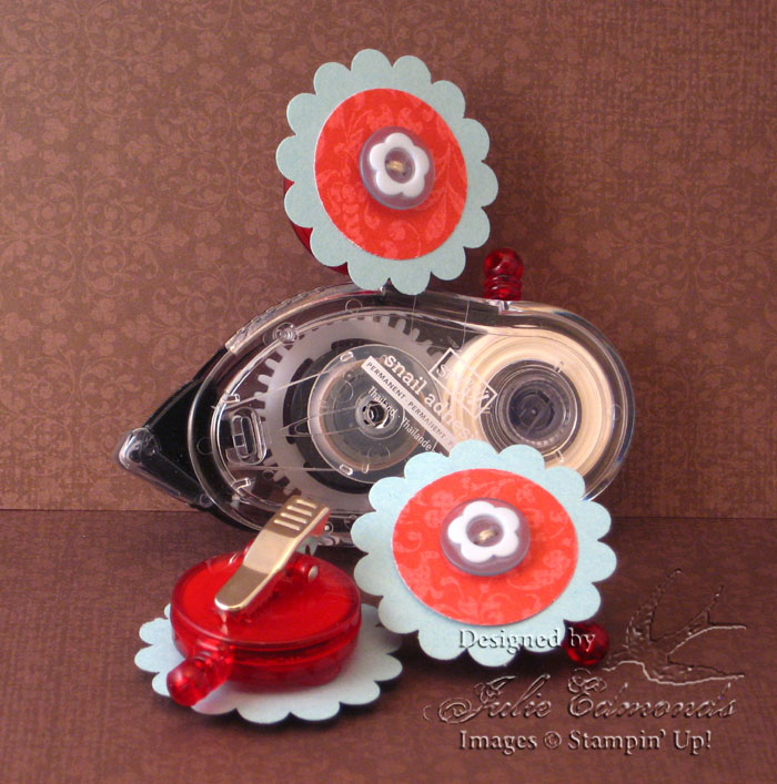 The Snail Leash is so simple to make. You simply take one fo those badge holder reels and decorate them. I used the Scallop Circle punch as a base, added a layer of the new Riding Hood Red designer series paper and a Baja Breeze Button. Then you attach it to the Badge reel with a Glue Dot.