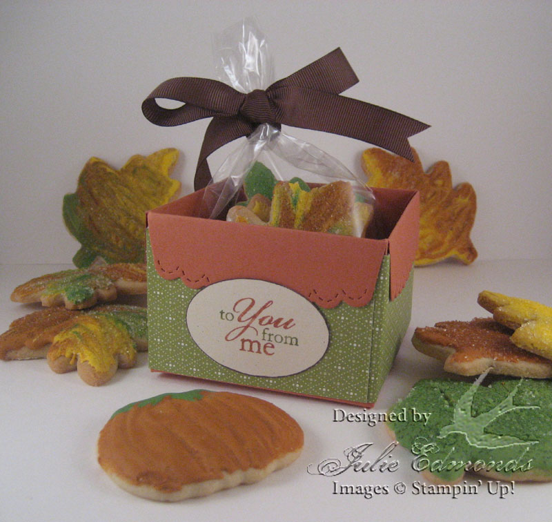 It was easy to swap also. I kept the boxes flat so they could get them home easily. For the picture I filled a cello bag with some of the cookies, tied it with a ribbon, and placed it in the box. Wouldn't these make great favors or place settings at your Thanksgiving Dinner?