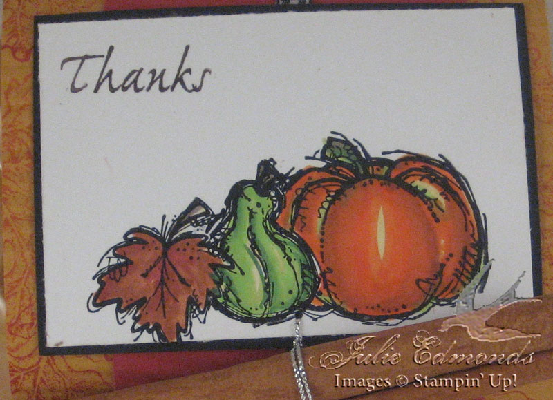 I'm taking a short break from the Christmas Card posts to give you a look at what I created for this month's team meeting swap. After all it is fall – one of my favorite seasons to stamp for! I love the leaves falling, the cold nip in the air, and of course the smells of Holiday baking! It truly is a season to be thankful for.