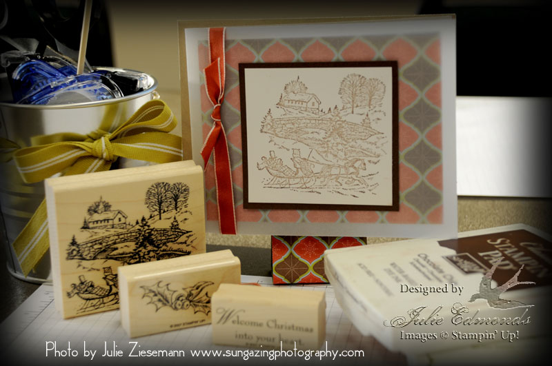 This is one of those cards that is even better in person – the Sleigh Bells scene from the stamp set Sleigh Bells Ring, was stamped on shimmer white card stock. The card is vellum card stock. With it's many layers of Designer Paper and card stock it's a very fun card! The greeting from the set was stamped inside the card along with the Holly Leaf and Berries. Finish it off with one of my favorite new ribbons – Riding Hood Red Taffeta and it's a WOW!