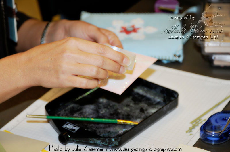 The fifth card for the class needed a touch of Dazzling Diamonds glitter. I can't believe we made it through the whole class with only one glitter card. It was very easy glitter – just dot the 2-way glue pen randomly over the card stock to make little dots of snow – then sprinkle with glitter and shake off the excess.