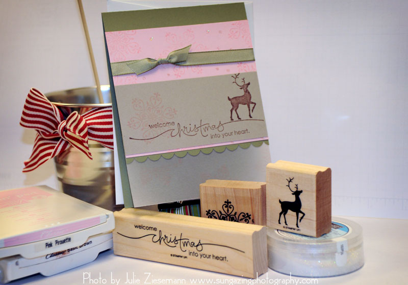 This card featured the stamp sets, Heard From The Heart and Winter Post. There is a vellum edge at the bottom of the card stamped with pink snowflakes. We used the new scallop punch to add a fun detail to the bottom of the card as well. This card is actually one of the easiest cards from the class but it pack a big WOW!