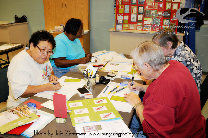 And last but not least!! Another card from Lisa. This one features a little watercoloring technique. We try to keep the cards as simple as possible to make them easy to mass produce but this one was crying out for a watercolor look. With the help of my color expert Crista we came up with a technique that is pretty quick and easy. To help the students out at the class we created a sample board showing the steps for coloring the image…