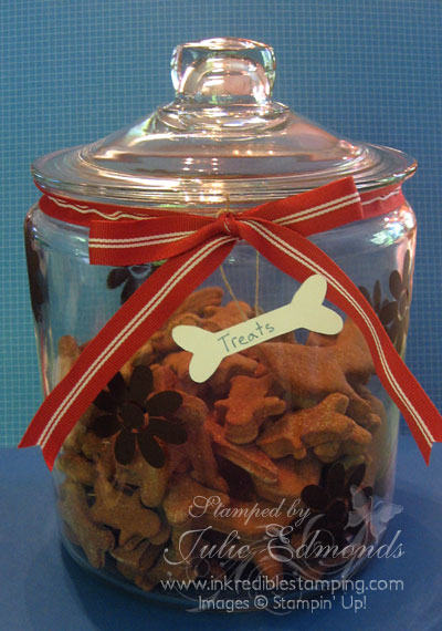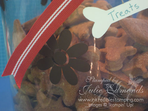 I finished the jar off with a little Riding Hood Red Striped Ribbon and a Bone that says treats. Remember the bone template we made at the punch art class with a word window and a couple of hearts? I just used that same template to trace and cut out two bones. Then I sandwiched a piece of Linen Thread in between them and tied it onto the ribbon.