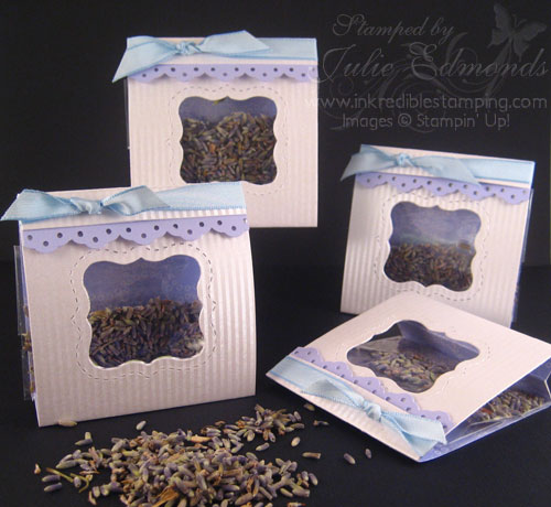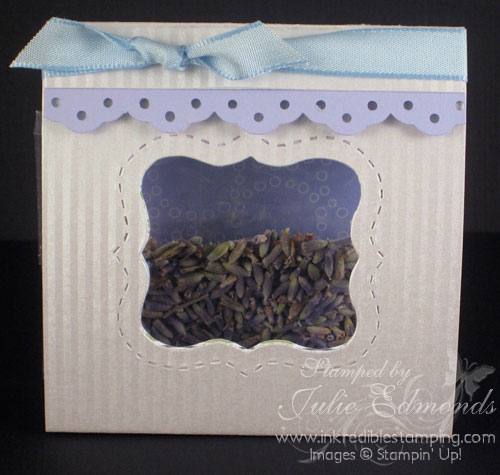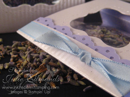I used adhesive to attach the Amethyst paper from Tea Party DSP to the White Striped paper from Taste of Textiles so that I would have the Amethyst inside showing through the window. After cutting the paper with the Movers and Shapers Die I did some scoring and modifying to create the pouches. Decorate the pouches (I had to add the blue ribbon just to make sure they had their little something blue) and add the small cello bag inside and you're done!