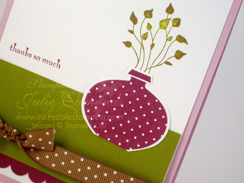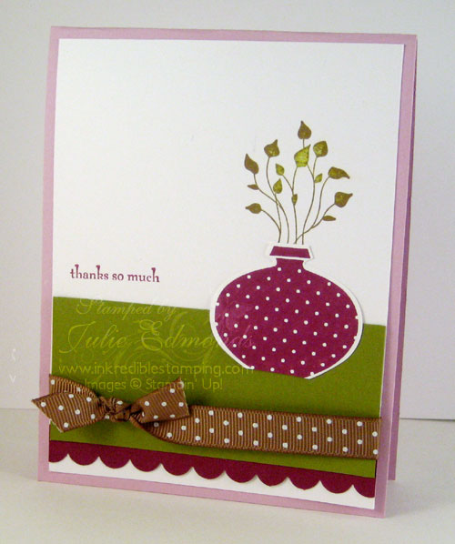 I don't remember where I first saw it but some genius figured out if you cut the bottom off of the Ornament Punch in the Mini Catalog you get a fabulous vase! Tie in the matching Stamp set and you've got Polka Dot Vase Cuteness. I had to create a vase card and since it's me it had to be purple…