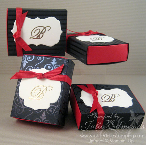 I love how the embossed Gold letter really pops against the Black and Red! The matchbox die is one of my favorite boxes. You can create cute favors and gifts for just about any occasion. Holidays, Showers, and More.