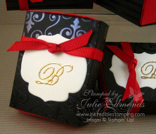 The boxes and Vanilla tags on top all came from Stampin' Up!'s Matchbox Die. We embossed the "B" in Gold. They went together very quickly and easily!