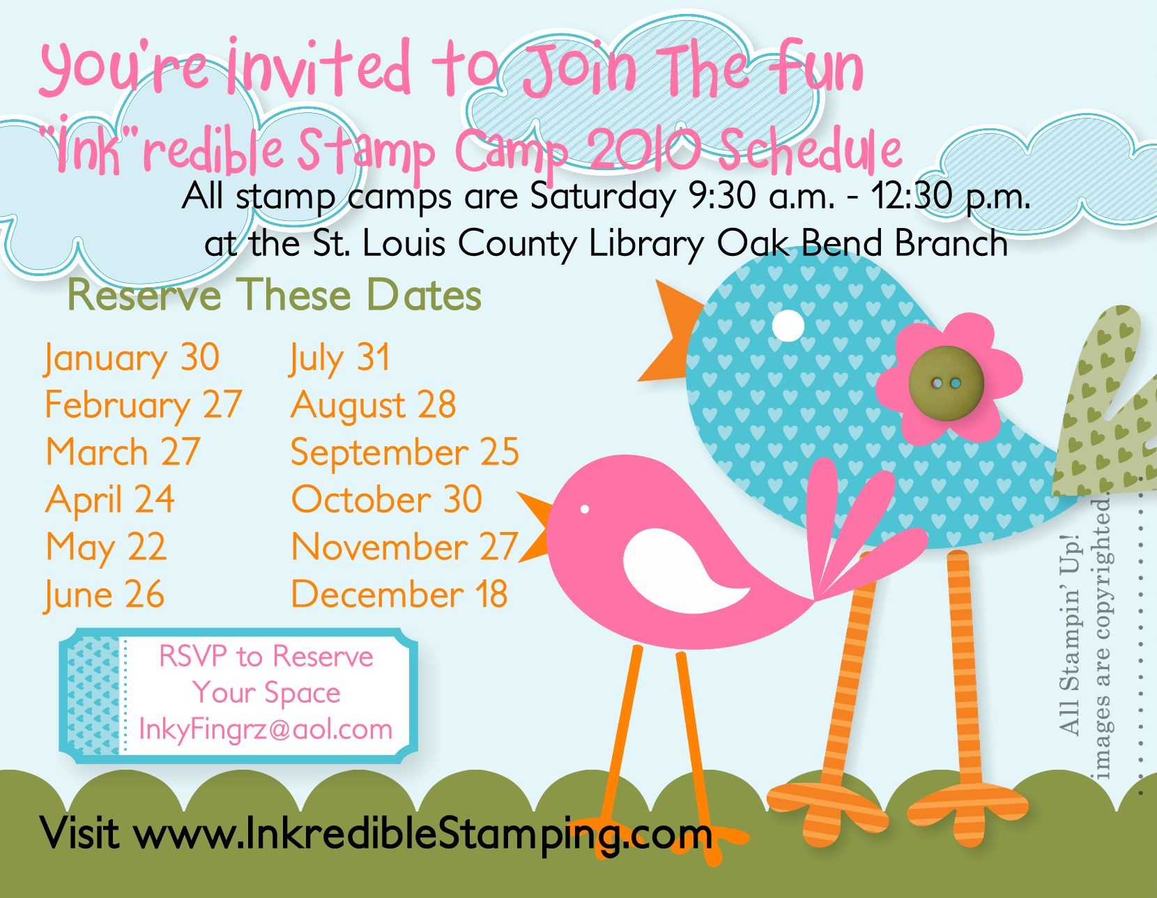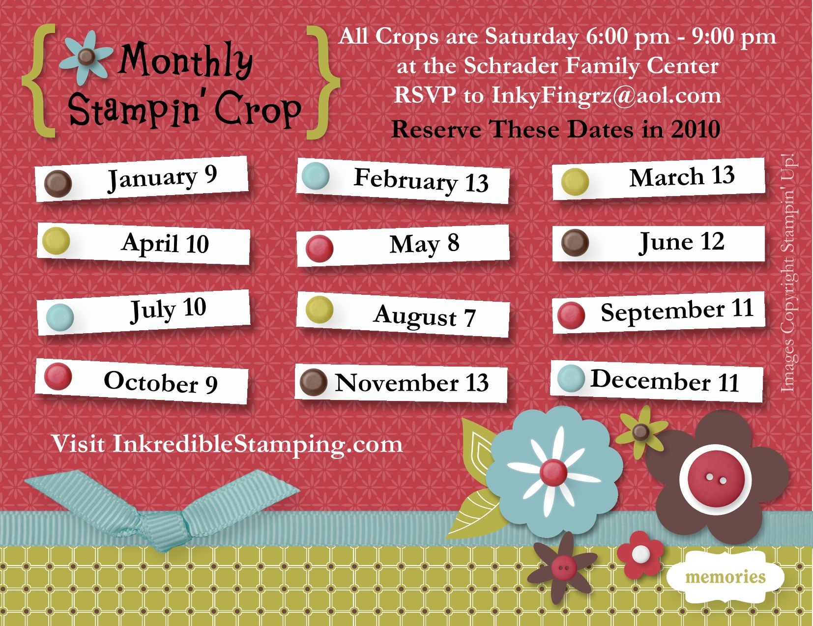 It's that time of year again. The time of year when I start booking my locations and filling my calendar with next year's Monthly Stamp Camps and Crops! π As most of you know I like to hand out postcards with the dates on them. This year I was SO excited to have Stampin' Up!'s new My Digital Studio to play with. Instead of using a simple generic design I was able to create postcards that scream Stampin' Up! π LOVE IT!!