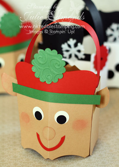 At our November Team Meeting Sue shared a Snowman Gift Bucket and also brought along supplies for us to create an Elf Gift Bucket. Who wouldn't LOVE to get a gift in one of these? Fill 'em with some Tissue Paper and you're set.