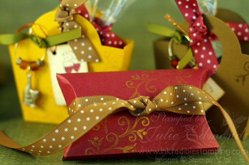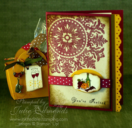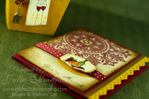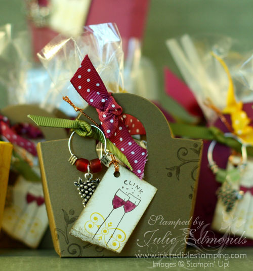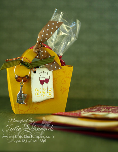 I stamped the box and the background of the tag using the Note to Self stamp set. The wine glasses on the tag came from an old set, Along the Same Lines.