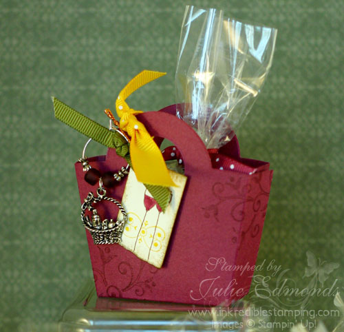 For the favor boxes I created these cute little baskets. The baskets are made using the Basket and Blooms BigzXL die. I trimmed off the tab and scored the front on each side at about 3/4" and put them together to form the boxes. I got the idea from another SU demo – Angie Juda and she has a great video tutorial for putting these together.