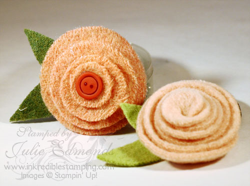 I'm back with another fun fabric project that I shared at my last team meeting. Fabric flowers are a very trendy accessory right now. If you look in the clothing magazines and stores you'll see fun flowers everywhere. Pin them to your clothes, clip them to a bag, where them in your hair, even decorate with them at home! And I've seen some pretty big price tags on the flowers in the stores!! Making them on my own makes my budget MUCH happier…