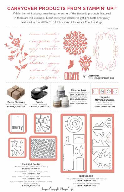 There are several products still avaliable for order even though they are not currently featured in a Mini Catalog. I know there has been some confusion about this and I get questions all the time about items on your wish list 🙂 … I'm thrilled that Satmpin' Up! put together a .pdf file featuring those products. Hopefully this will help clear up the questions for everyone and you'll be able to get some items off your wishlist that you might have though you missed your chance to get!! View the .pdf here or check out the pictures below: