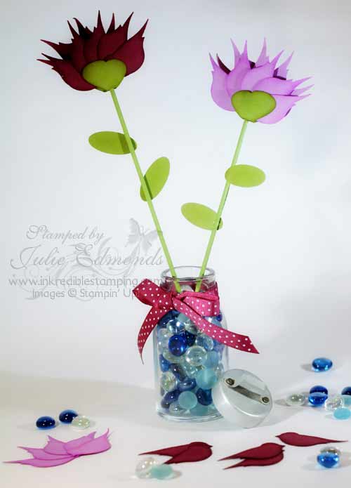 When I came up with this flower idea it reminded me of a fun exotic flower, so I simply call them Exotic Flowers (I know I'm real original) Of course at the class they were a little more original with the name of the flowers. There are made using the 2 Step Bird Punch and at the class they lovingly called these Bird (I'll use a nicer word then them) Hiney flowers. 🙂 So you can call them whatever you want – but no matter what you call them – wouldn't they made a great addition to a spring picnic table?? Or imagine them done in your wedding colors as centerpieces for a Wedding Reception or Bridal Shower…