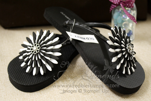 Debbie took these boring flat black flip flops and made them FABULOUS! This was one of prizes we gave away at our Punch Art Garden class back in May. If you want to see more of the prizes we gave away visit my Facebook Page and check out the photo album for Punch Art Garden Prizes.