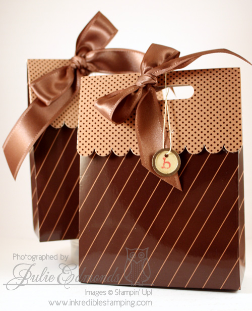 My wrapping for these gifts was a little bit of old and a little bit of new. I had some Treat Boxes left over from last year's Idea Book and they were a perfect size for the gifts so I dropped them in there and tied a Chocolate Chip Satin ribbon through the handle. I added a Vintage Tag stamped with the first letter in each of their names to the box and I was finished. So quick and easy but I think they look great and best of all they'll hopefully travel pretty well in their catty ons – I wanted something that would take a little abuse! π
