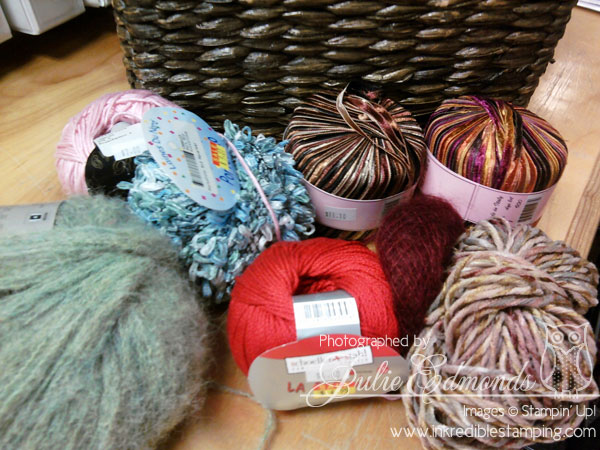 I started off by looking through the yarn bins at the store to pick out some fun items to embelish the tags we'll be making. So many choices – I could have continued picking all day – but I keep the choices to a reasonable number! π Here's the fibers I picked out to work with.