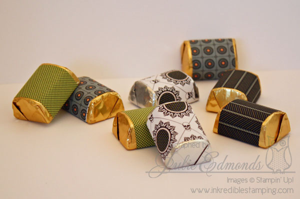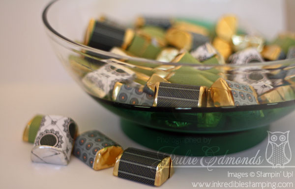 Did you know with the My Digital Studio Downloads you can print out your own papers?? Even if you don't have the My Digital Studio program you can still purchase the papers and use them in your own photo editing programs. And if all you're creating is a sheet of background paper you can just open up your word processing program – insert the picture file and print away… Are you as excited as me yet??? WAIT there 's more – you can print out that DSP onto card stock when you want a stronger paper to create a box or book cover AND when you want stickers you can print out the DSP right onto your Sticker paper or labels. Now you have DSP that doesn't even need adhesive!! That's how I created the Nugget wrappers I made for our Stamp Camp Trick or Treating yesterday!