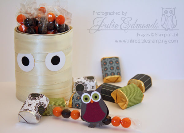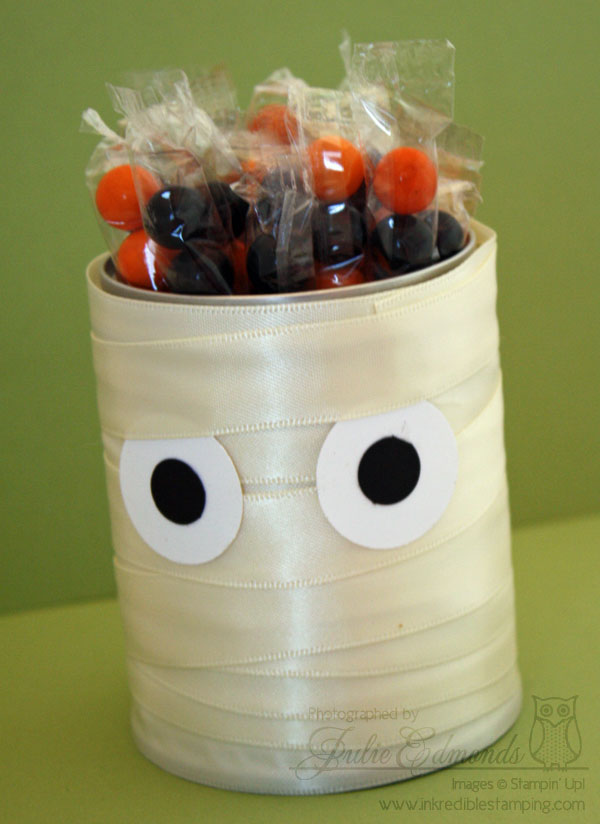 just wrap some Very Vanilla Satin Ribbon around an empty can. Attach some Circle Punches for Eyes and fill with candy – This would be a fun craft for the kids!! (Just make sure you're using cans or containers with no sharp edges if you're playing with the kiddos!)
