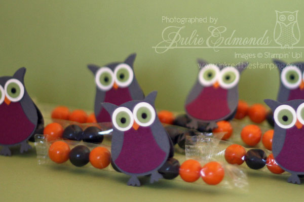 These were another easy treat. I just made up some owls using our 2 Step Owl punch and then attached it to a stick of sixlets. Then I sandwiched a second owl body on the back to help them stand up.