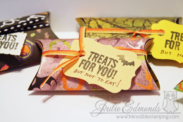 Priscilla used the Pillow Box die to cut out Halloween papers and make these cute boxes. She filled them Stampin' Treats – lots of fun little brads and goodies to play with – I'm not sure which is better Chocolate or Stampin' Goodies – that's a pretty close race in my book!! π