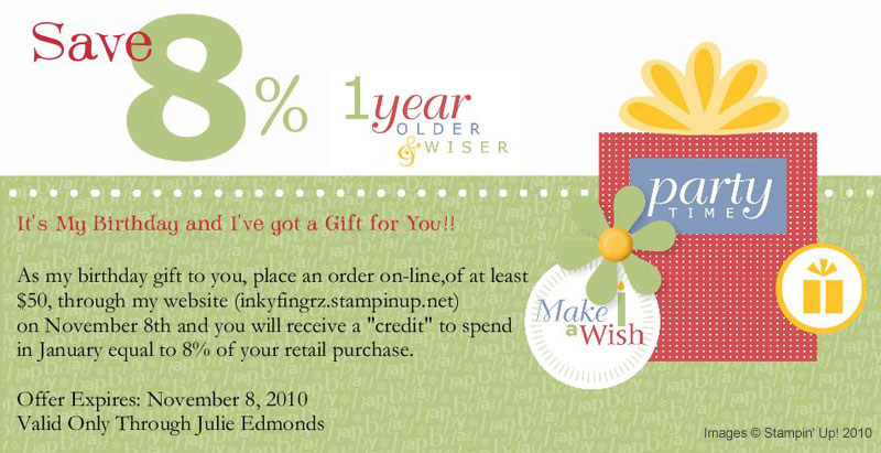 Shop online with me on my Birthday, November 8th, and when you spend at least $50.00 I'll send you a "credit" to spend in January equal to 8% of your retail purchase. It's Inkredible Stampin' Cash!! š