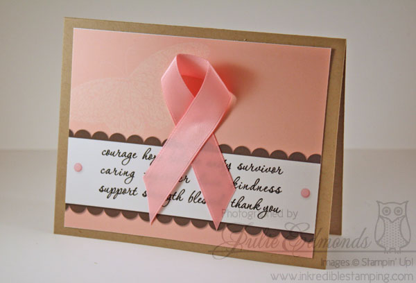 I created the background complete with tone on tone butterfly (I know it's hard to see in the picture – but REALLY pretty in person), the greeting, and digi brads. I printed them out, cut them to size and mounted them onto a Crumb Cake card. Then I created an awareness ribbon with Pretty in Pink Satin Ribbon and added that to the card front. I love the way they came out and I think it is a GREAT "Showing My Support" to send to someone who is batteling Breast Cancer.