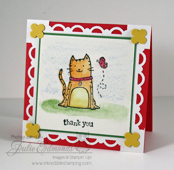 We used the Touch of Kindness Stamp Set (See it Online), and used the Watercolor Crayons and an Aqua Painter to color in the kitty. Here's the full supplies list…