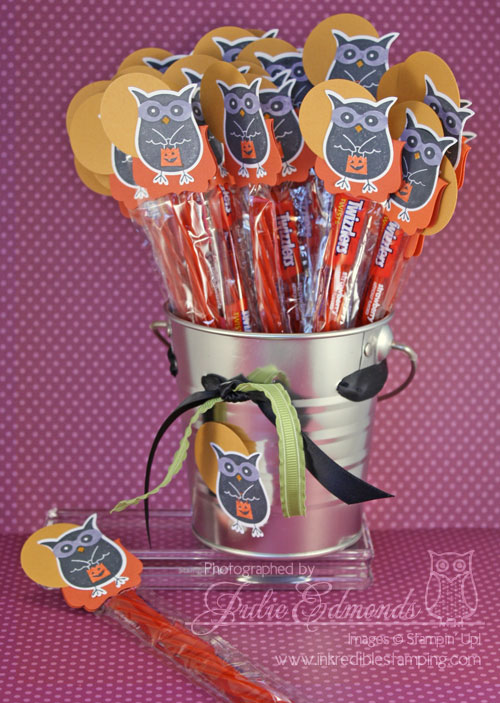 Just Stamp the owl and punch him out. Then do a little coloring to highlight his mask and bag. We added a punched circle for the moon and folded the label punch to create a topper for our candy!