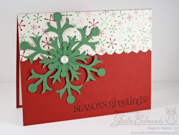 Debbie made a fun card using one of my favorite dies in the Holiday catalog – Snow Flurry (127813)