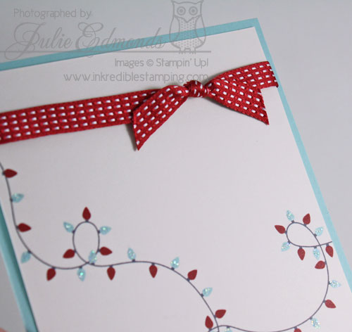 I used the Twinkling Joy Greeting Card Template for this card. I copied the front design so it was also on the inside right of the greeting card and had them printed. Then when you get them in you cut them apart, mount on card stock, add a little ribbon and some Dazzling Details so those lights really twinkle…