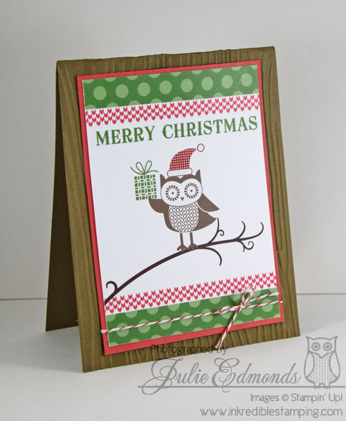 I used the template included with the Owl Occasions Stamp Brush Set for this card. It was note card sized – so very easy to mount onto a layer of card stock and then onto a regular sized card embossed with the Woodgrain Embossing Folder.