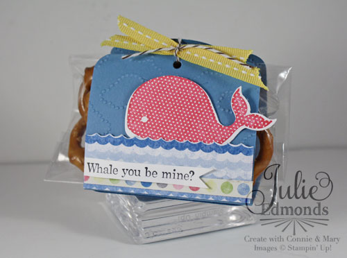 I'm in LOVE with the Oh, Whale stamp set – perfect for Valentines, Thank You Cards, and so much more! This year I wanted a valentine that wasn't just about candy, and this two tags box is perfect for tucking a cello bag full of something fun like pretzles (or Gold Fish – how cute would that be in a Whale box?) Of course you can also tuck in a cello bag full of chocolate 🙂