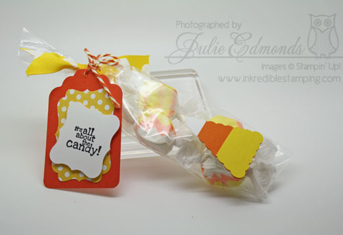 For this treat she took a small bag or Candy Corn Salt Water Taffy and dressed it up a bit. The tag tied on top i stamped with the greeting from Halloween Hellos. I love the classic color combo or Daffodil Delight, Pumpkin Pie, and Whisper White!