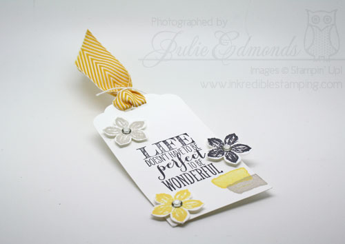 The tag was one of the make 'n takes that also featured the Perfect Pennant and Petite Petals stamp sets. We used the Scallop Tag Topper Punch for the top of the tag and tied a bit of Cruched Curry Chevron ribbon onto the top of the tag.