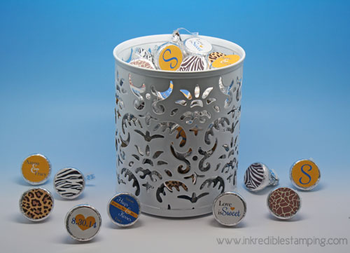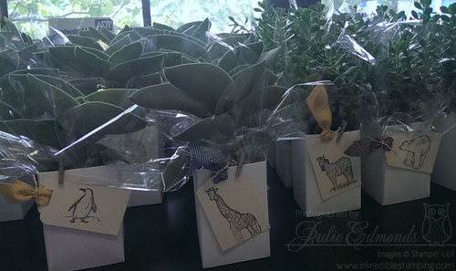 We did have a few SU touches as well – we created boxes with the new Gift Box Punch Board (See it Online) to create simple white boxes for their plant party favors. We stamped and color tags using the retired Zoo Review stamp set – which My Aunt ordered just before it retired – knowing i would be perfect for the wedding…