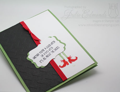 The second I saw the shoe greeting in the Tee-hee-hee Stamp Set I knew I had to do a Wicked card. I wanted to give the shoes a little ruby red sparkle – so I added a very light layer of Cherry Cobbler Dazzling Details to them.