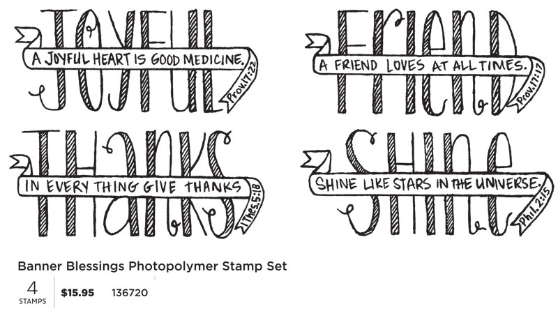 The new photopolymer stamp set for November is fun and Uplifting!! Banner Blessings will surely bring a smile to many faces. A crowd favorite, this stamp set will be sure to shine. Recommended clear block size is D (not included in the set).