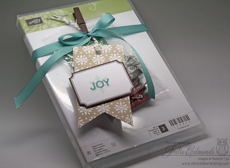 I used the Under The Tree Tag a Bag Accessory Kit and the Trendy Trims Stamp Set to create this tag. Using the Lost Lagoon and Soft Sky ink with the brown tags from the kit was a fun way to get a different look from the tag kits original Red and Green color scheme…