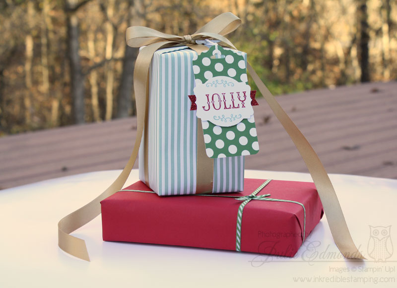 This fun present stack was created as one of the decorations at the Christmas Stamp a Stack – I got busy at the class this year and didn't get as many pictures as I normally do at the classes – fortunately I did snap a picture of the present stack outside before we left 🙂