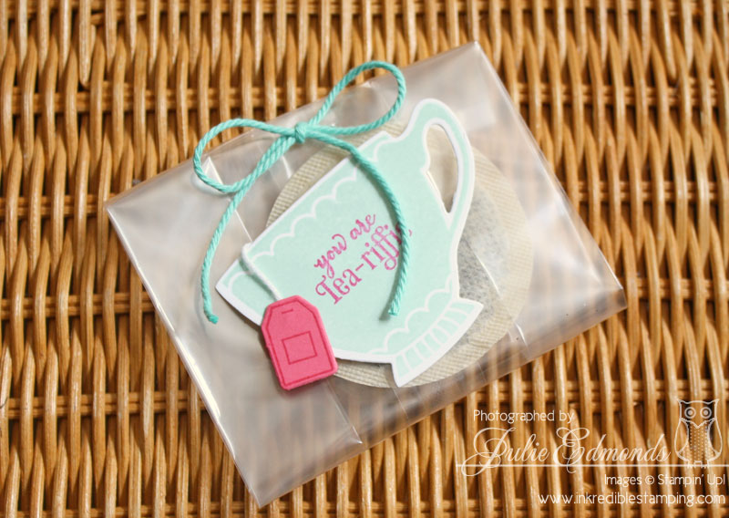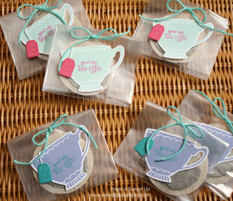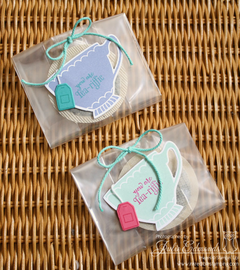 Recently Mom had a Tea Party to attend. They were all supposed to bring along a favorite tea to share – Mom's favorite Tea is Vanilla Almond from Republic of Tea. We though it would be fun to dress up the team bags in a little take home favor bag. So I pulled out the A Nice Cuppa stamp set and cordinating framelits. We stamped and die cut the tea cups with a "You're Tea-riffic" greeting on the cups. A perfect addition to our cello bags stapled shut and tied with ribbon.