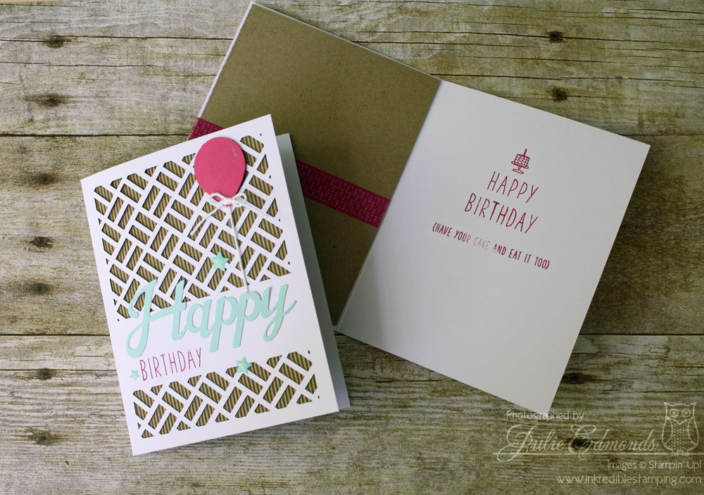 As excited as I was by the color combo – I wanted to play around and see if I could change it up a bit. One of my favorite combos right now are Melon Mambo, Pool Party, and Crumb Cake – so I pulled out some Kraft Corrugated Paper and Melon Mambo ink and card stock and this is what I came up with…