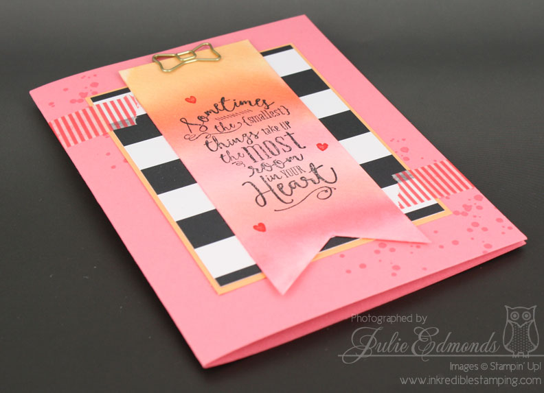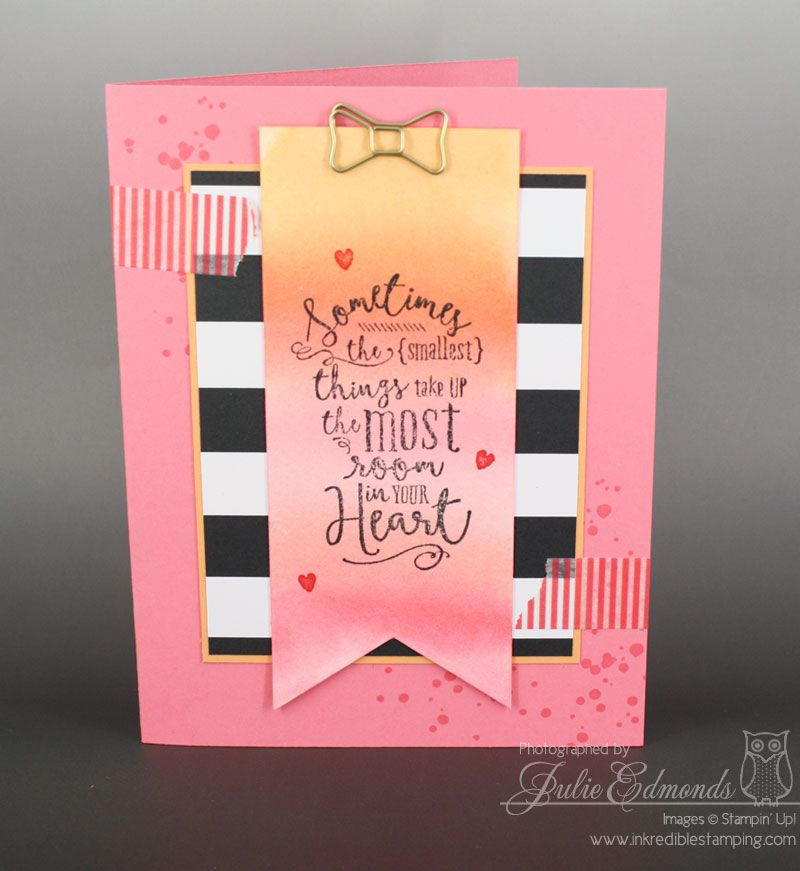 For this card I used Peekaboo Peach, Tangerine Tango, Flirty Flamingo, and Watermelon Wonder. I wet down a piece of Watercolor Paper and then used the Aqua Painter to brush on the ink, working my way down the paper strip and blending the colors together. I love the way the banner came out!