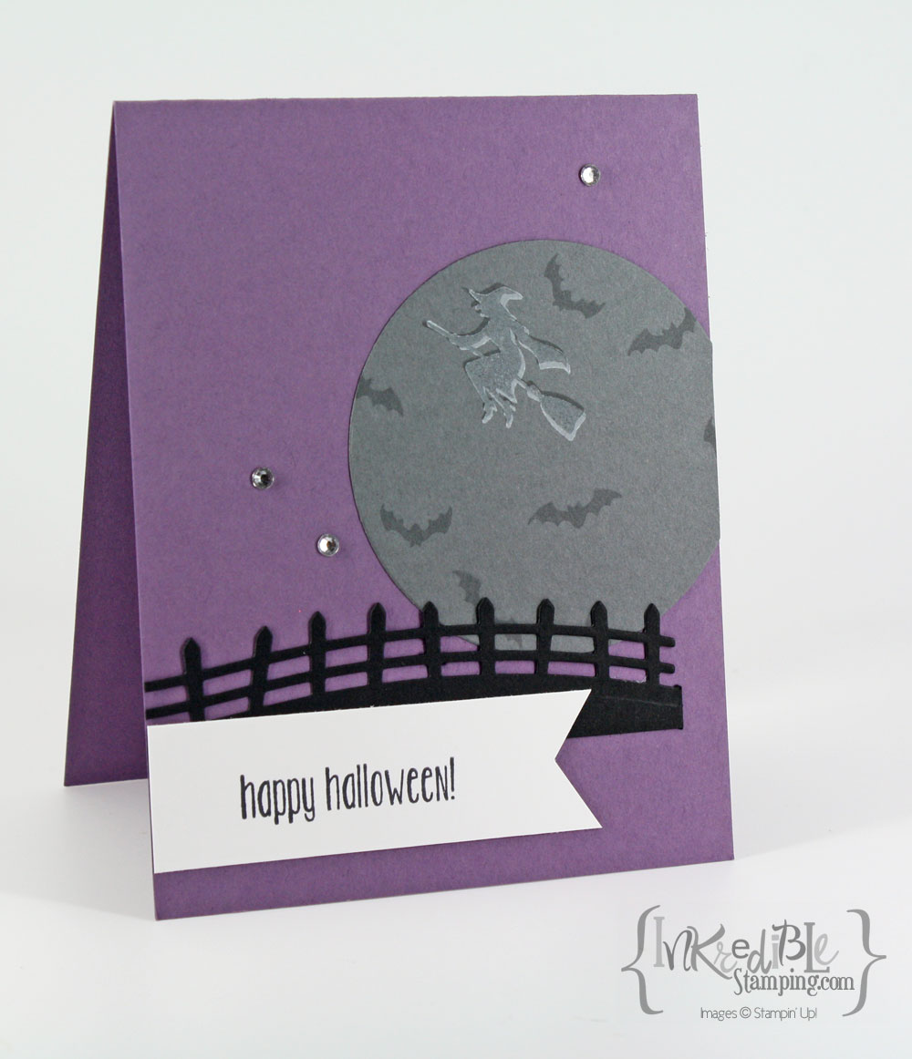 Ghosting is a very simple technique. First you stamp a solid image (like the Witch on this card) in Whisper White ink on Dark Card stock. Let is dry a bit. Then stamp over it, just slightly offset, with a color. For this card we used a tone on tone look with the Basic Gray ink. But it works great with other colors as well!