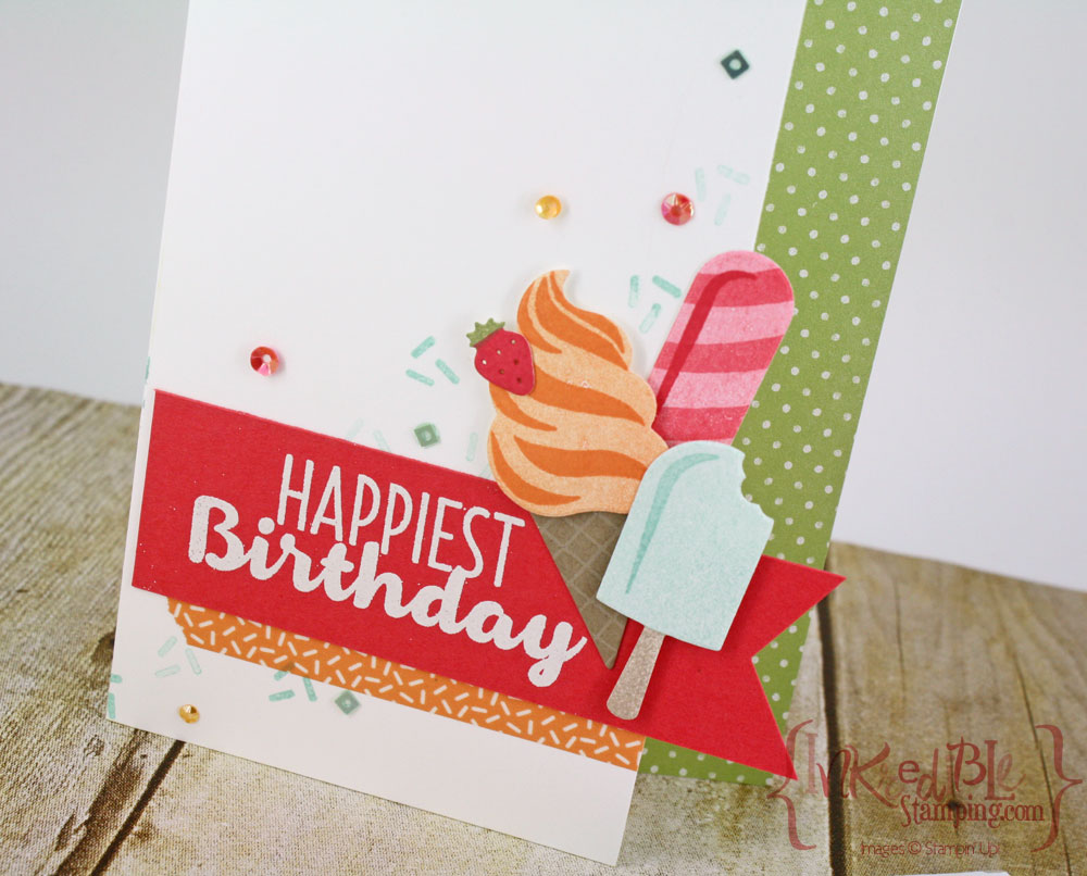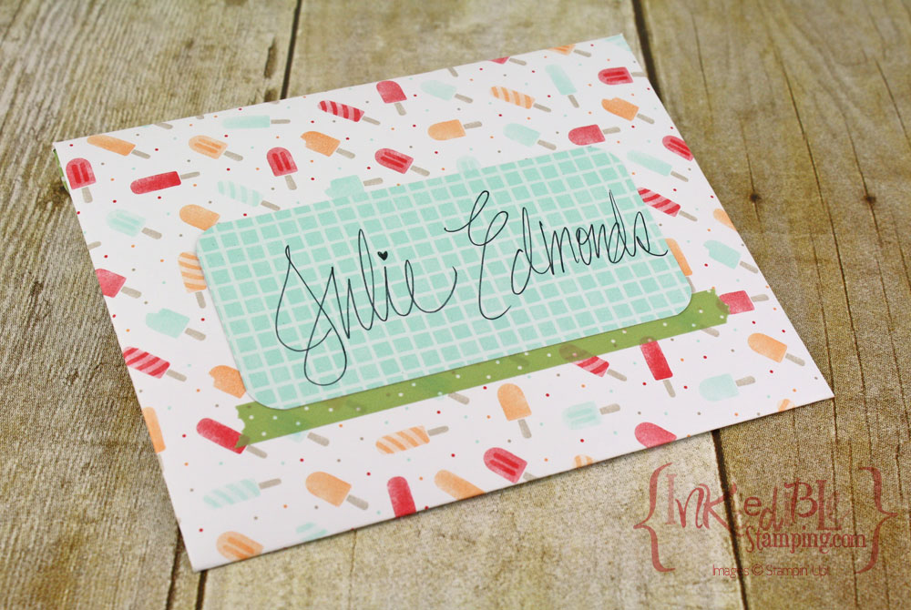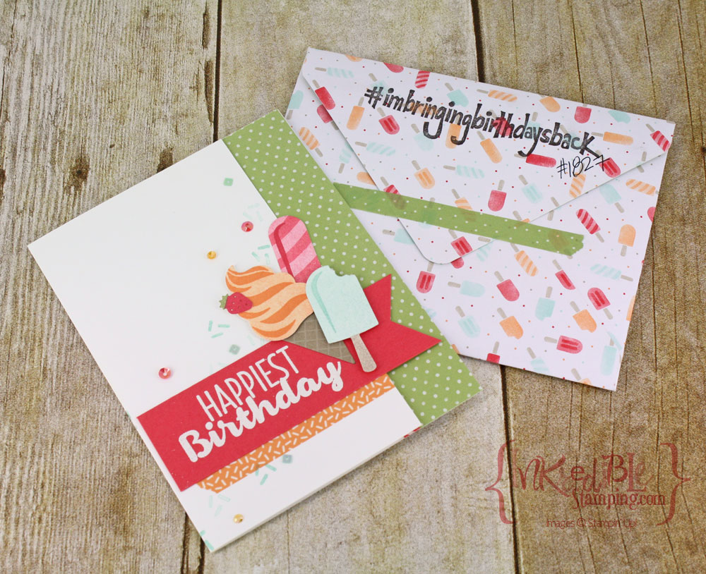 And the card and envelope feature another Sneak Peek at Products that will be coming in January's Occasions catalog! The Cool Treats Suite is full of yummy papers, stamps, and embellishments!