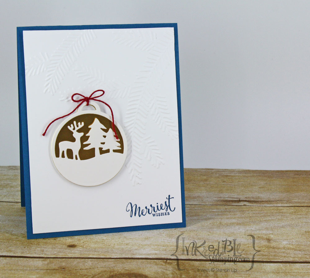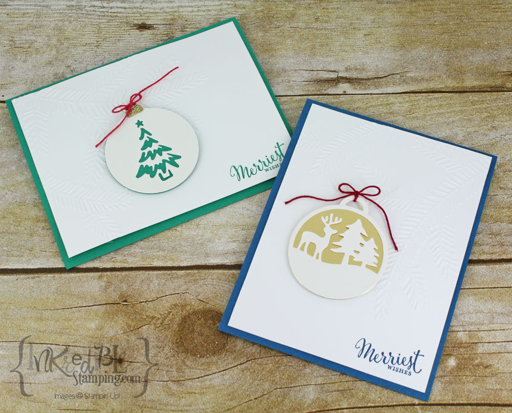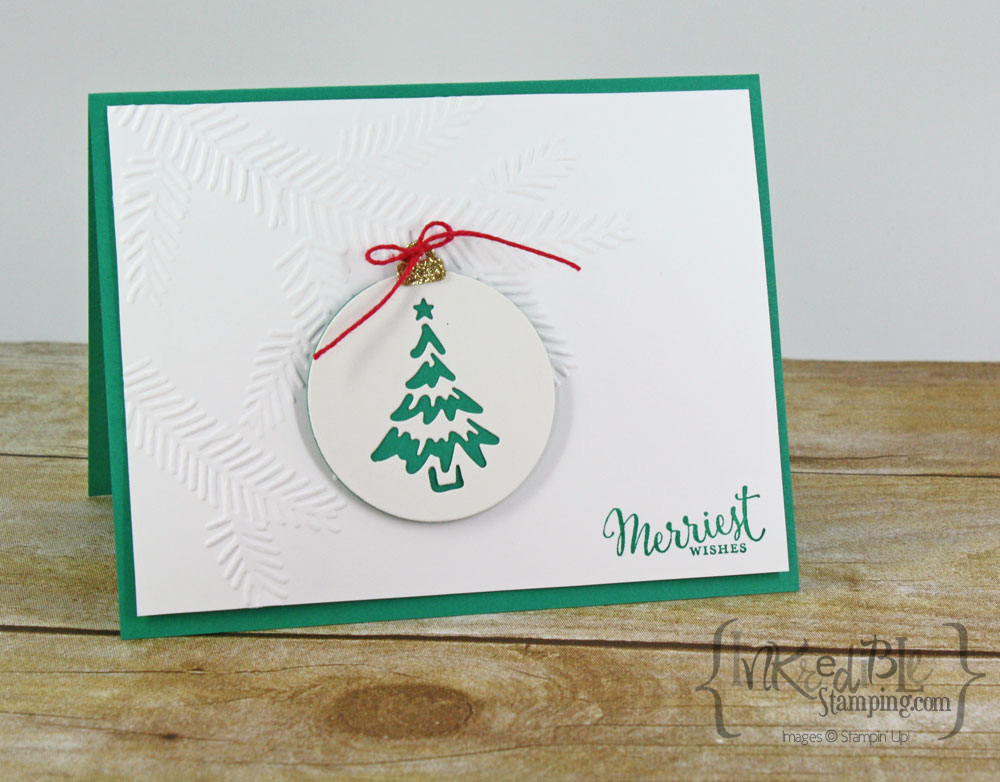 I used the Pine Bough embossing folder for the background on the cards. The first card is done in Emerald Envy with a Christmas Tree ornament.
